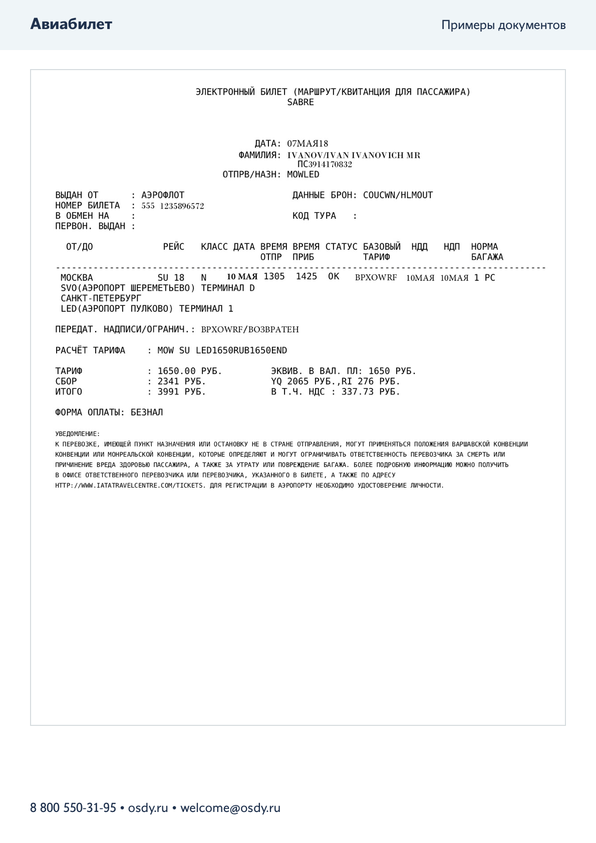 Пакет документов для командировки: электронный авиабилет, электронный